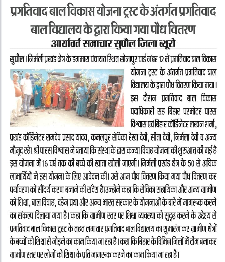बिहार के सभी जिलों के ग्रामीण क्षेत्रों में प्रगतिवाद बाल विकास योजना के अंतर्गत प्रगतिवाद बाल विद्यालय की स्थापना की जा रही है। इसे चलाने हेतु हर वार्ड में एक सेविका और एक सहायिका की नियुक्ति की जा रही है। एवं सभी ब्लॉक में एक सुपरवाइजर की नियुक्ति होगी। नियुक्ति की प्रक्रिया शुरू कर दी गई है । आवेदन फार्म के लिए कार्यालय से संपर्क करें।