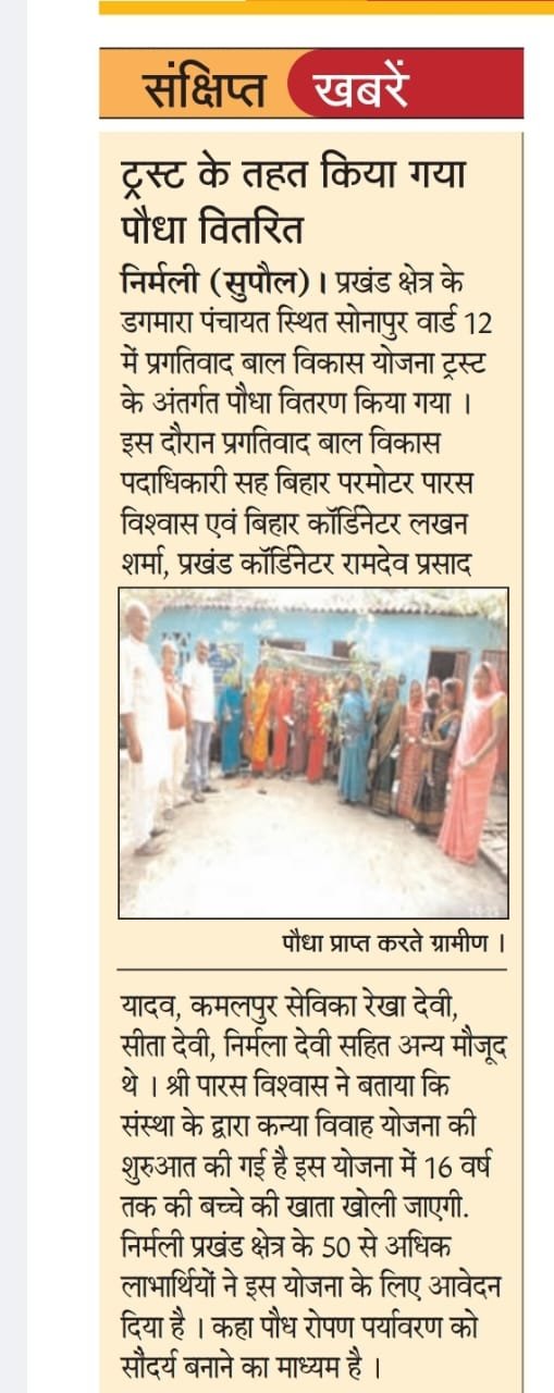 प्रगतिवाद कन्या विवाह योजना विस्तृत जानकारी :- प्रगतिवाद बाल विकास योजना पिछले 5 वर्षों से ग्रामीण एवं शहरी क्षेत्रों में विभिन्न योजनाओं के माध्यम से समाज को लाभान्वित कर रही है। इनमें से एक महत्वपूर्ण योजना **"प्रगतिवाद कन्या विवाह योजना"** है, जिसका मुख्य उद्देश्य **बाल विवाह को रोकना** तथा आर्थिक रूप से कन्याओं के उत्थान को सुनिश्चित करना है। प्रगतिवाद कन्या विवाह योजना के प्रमुख बिंदु: 1. विवाह निधि कोष - संस्था द्वारा पंजीकृत सदस्य की बच्ची (0 से 16 वर्ष आयु) के लिए "विवाह निधि"नामक एक कोष स्थापित किया गया जाऐगा। - बच्ची के नाम से एक अनुदान खाता खोला जाएगा, जिसमें माह ₹ 100 रु से लेकर 11000 रू० तक को जमा करना होगा । - यह राशि विवाह के समय अभिभावकों को सहयोग राशि के रूप में प्रदान की जाएगी। 2. सदस्यता शर्तें - खाता सक्रिय रखने के लिए सदस्य को प्रतिमाह न्यूनतम ₹ 100 रु से लेकर अधिकतम 11000 रु० तक का अंशदान देना अनिवार्य है। - सदस्य को अंशदान पुस्तिका प्रदान की जाएगी, जिसमें योगदान का विवरण दर्ज रहेगा। 3. महोगनी पौधा योजना - बच्ची के नाम पर दो महोगनी के पौधे दिए जाएंगे, जो 12-15 वर्षों में ₹60,000 से ₹80,000 तक की मूल्यवान लकड़ी प्रदान करेंगे। - इस राशि का उपयोग बच्ची के विवाह में किया जा सकता है। 4. छात्रवृत्ति एवं प्रोत्साहन - यदि बच्ची दसवीं कक्षा में प्रथम श्रेणी से उत्तीर्ण होती है, तो संस्था द्वारा उसे एक मोबाईल फोन प्रदान किया जाएगा। 5.आकस्मिक दुर्घटना बीमा - बच्ची के अभिभावक की आकस्मिक मृत्यु या दुर्घटना की स्थिति में ₹11,000 की सहयोग राशि दी जाएगी। 6. स्वास्थ्य सुविधाएँ - पंजीकृत सदस्यों एवं उनकी बच्चियों के लिए समय-समय पर निःशुल्क स्वास्थ्य शिविर आयोजित किए जाएंगे, जिनमें डॉक्टरी परामर्श एवं जाँच की सुविधा उपलब्ध होगी। 7. आवेदन प्रक्रिया - योजना का लाभ लेने के लिए ₹750 का आवेदन शुल्क देना होगा। -शारीरिक रूप से दिव्यांग या अनाथ बच्चियों के लिए पंजीकरण निःशुल्क है। निष्कर्ष: प्रगतिवाद कन्या विवाह योजना समाज में बाल विवाह की रोकथाम एवं कन्याओं के सशक्तिकरण हेतु एक सराहनीय पहल है। इससे जुड़कर हम सभी समाज के उत्थान में अपना योगदान दे सकते हैं। प्रगतिवाद बाल विकास योजना से जुड़ें, सहयोग करें, और समाज को बदलने में भागीदार बनें! धन्यवाद